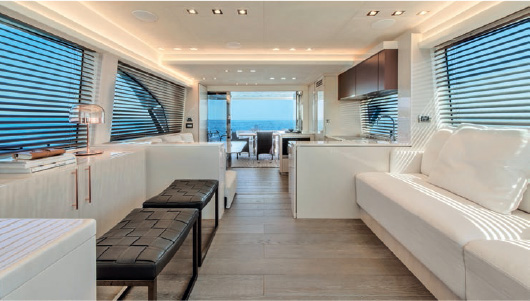 La luce naturale diventa un elemento di progetto nell’open space del salone interno, in cui le differenti aree funzionali, inclusa la postazione principale di pilotaggio, sono percettivamente ampliate proprio grazie alla luminosità dell’insieme. Brise-soleil alle ampie aperture vetrate ne modulano il grado, calibrando e ritmando il percorso ininterrotto da poppa a prua.