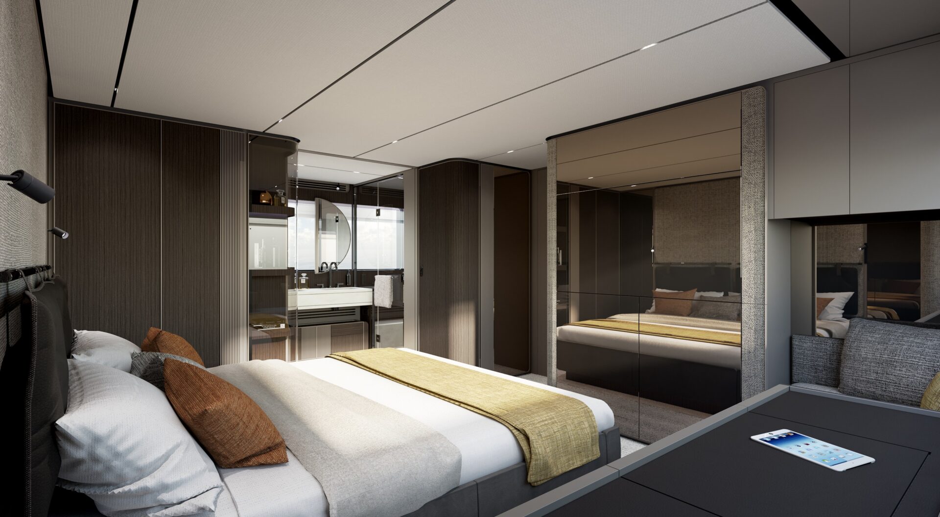 A poppa del main deck si trovano i 18 mq della beach area, con un divano vista mare che integra un ampio vano storage e una plancetta dotata di linear lift per il varo e l’alaggio del tender. Il pozzetto di 19 mq ospita invece un’area living arredata con mobili free standing, che offrono una maggiore flessibilità in termini di configurazione e utilizzo. Nel salone interno di 29 mq, la sala da pranzo (disponibile nella versione standard) può essere sostituita con una show kitchen dotata di bancone bar e sgabelli, mentre la cucina principale all’estrema prua del main deck è caratterizzata da una vetrata elettrica a scomparsa che la mette in diretta connessione con l’All-Season Terrace.