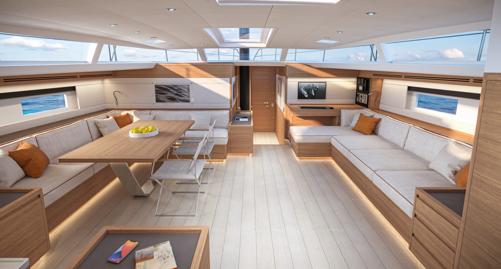 Cuore pulsante dello yacht è il salone, dove a sinistra si trova un accogliente divano a L con un tavolo da pranzo che può ospitare comodamente fino a 8 persone, mentre a dritta è collocato un elegante divano a U che si estende verso prua fino alla zona carteggio, con plancia a parete e cassettiere portaoggetti sottostanti.