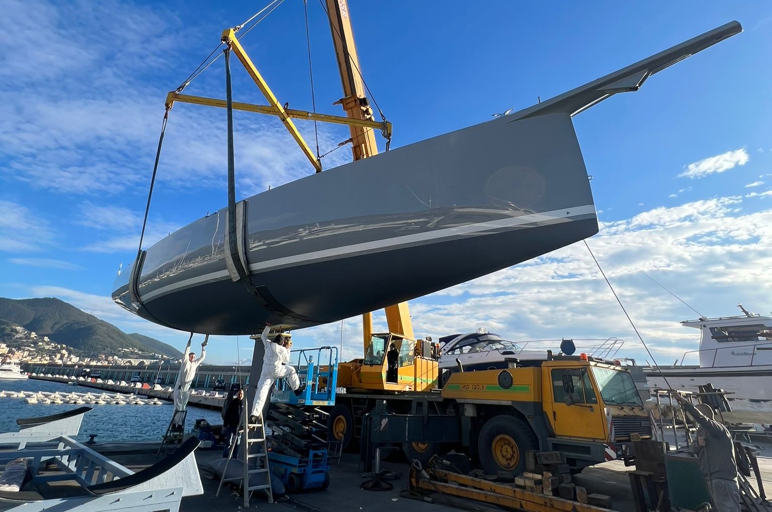 Queste scelte, oltre a contenere i pesi, conferiscono alla barca una solidità e una robustezza in grado di sopportare le ripetute sollecitazioni e i forti carichi che si affrontano anche nelle regate più impegnative. La chiglia è un nuovo progetto custom, realizzata in acciaio Weldox700 ad alte caratteristiche meccaniche e con un pescaggio finale di 3,4 metri, mentre il bulbo è lavorato a CNC secondo innovativi studi CFD e ha un peso di 3.700 kg, da aggiungere ai 600 della lama.