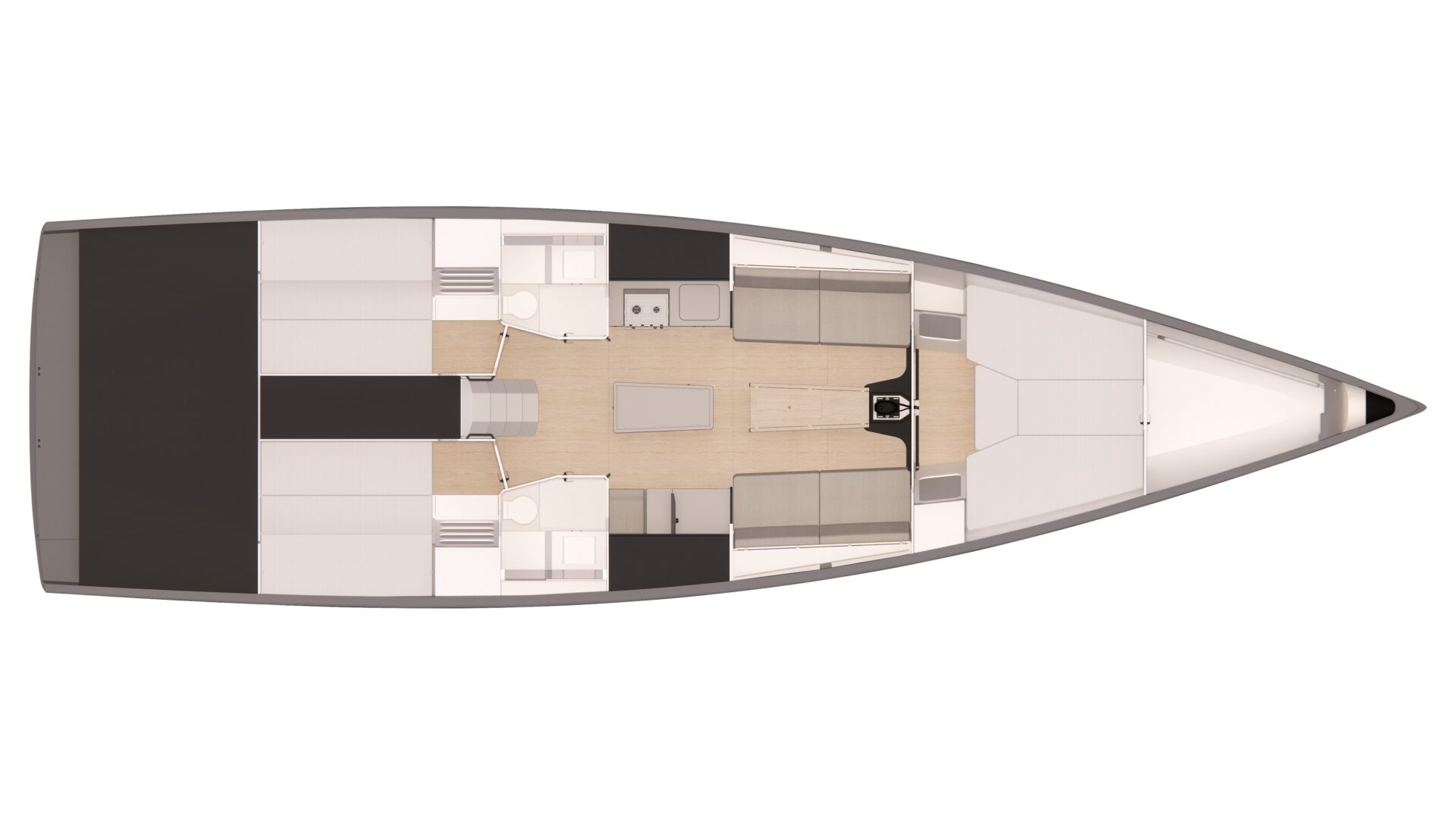 Il timone con pala e asse in carbonio è stato riprogettato ex novo e risulta molto allungato e con una ridotta superficie laterale, garantendo così un ottimo controllo anche ad imbarcazione sbandata o fortemente caricata. L’attenzione alla sicurezza rimane infatti un tema centrale sia dal punto di vista progettuale che costruttivo. L’attrezzatura di coperta è adeguata alle esigenze dell’armatore e l’albero, in carbonio ad alto modulo, è stato preparato e studiato insieme al Racing Department di Axxon.