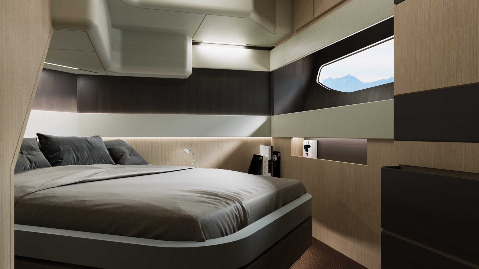 Due i possibili layout anche sul piano di coperta, con la possibilità di avere una porta che separa il salone dall’area poppiera oppure optare per una soluzione open-space che rende contiguo l’intero piano di calpestio. Nel pozzetto è prevista poi una TV celata all’interno di un apposito mobile, apribile elettricamente. Sempre in tema di personalizzazione, lo yacht è progettato per l’installazione di sofisticati sistemi di ultima generazione per la gestione dell’impiantistica di bordo.