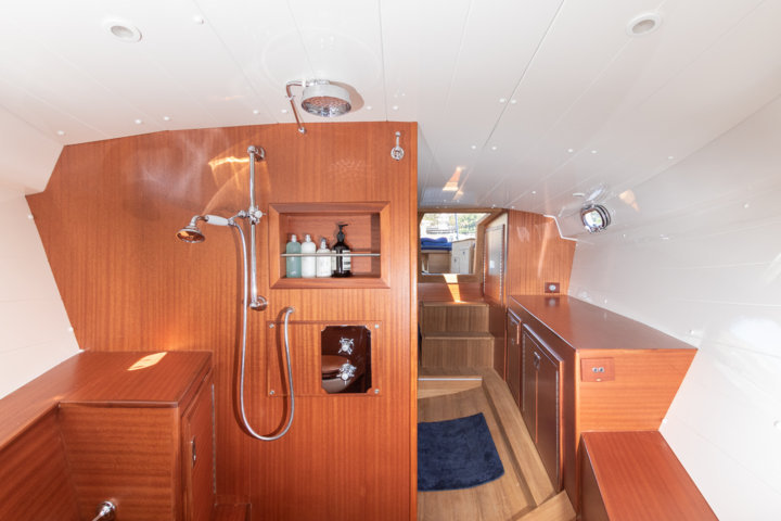 Scafo e coperta sono di vetroresina stratificata a mano, con gabbia strutturale di rinforzo e paratia prodiera di collisione per aggiungere la resistenza alla leggerezza, mentre il legno è il vero protagonista delle finiture e degli arredi.