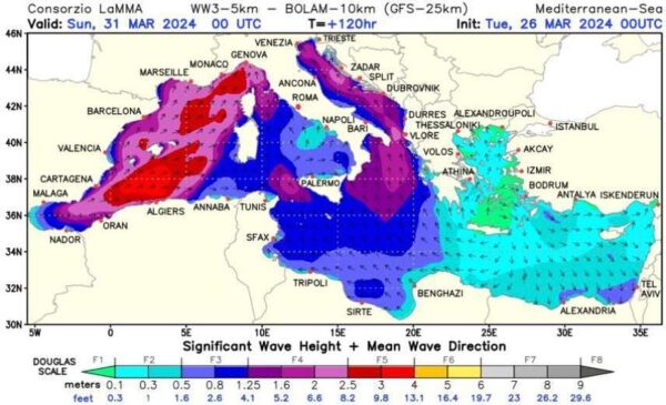 Stato del Mediterraneo per l’ultimo giorno di marzo secondo il Consorzio Lamma