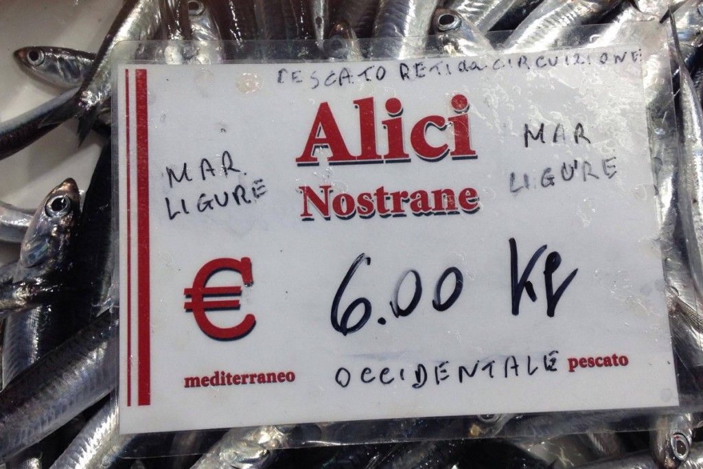 I pesci locali più comuni in Liguria sono gli sgombri, le triglie, le ombrine, le orate (con un prezzo più o meno equivalente a quelli di provenienza estera), i saraghi, le lampughe, i calamari (più economici di quelli di provenienza estera), i totani e soprattutto le acciughe che in Italia hanno una media dai 2 ai 6 euro al chilo e in Liguria si assestano sul vertice alto della forbice. L’acciuga resta uno dei tipici prodotti del mare italiano, e Mediterraneo in generale, e sui banchi regionali è facile trovare prodotti locali. La specie però viene attentamente monitorata perché sottoposta a un prelievo molto intenso.