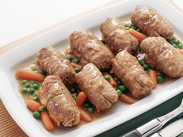 Riempte le fettine, poi arrotolatete e passatele in farina. Dopo aver preparato gli involtini, soffriggete in padella il restante aglio in olio, dopo alcuni minuti adagiate i rotolini, fate cuocere cinque minuti circa, poi sfumate con il vino bianco, se il sugo si asicuga troppo aggiungete dell’acqua. Fate ancora andare cinque minuti. Serviteli caldi con delle verdure bollite di contorno.