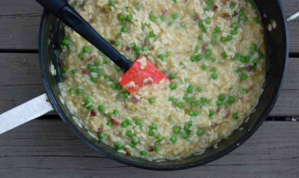 Tagliate la cipolla a pezzetti e rosolatela in padella con un filo d’olio, quando sarà appassita aggiungete lo speck e i piselli. Lasciate cuocere per circa 5 minuti, poi aggiungete il riso. Fatelo insaporire per altri 5 minuti, sfumate con il vino bianco e incorporate metà del brodo. Quando si sarà assorbito aggiungete anche l’altra metà. A cottura ultimata spegnete la fiamma, mantecate con il parmigiano. Servite con una spolverata di pepe.