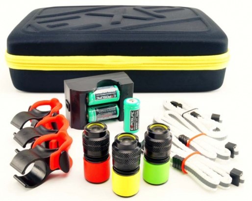 Al suo interno contiene tre micro torce XS, tre lenti in silicone di colore differente (bianca, rossa e verde), tre supporti per tubi di diametro variabile (da 18 a 35 mm), tre batterie ricaricabili e relativo caricatore e tre cordini da collo in Dyneema® ad altro potere riflettente.