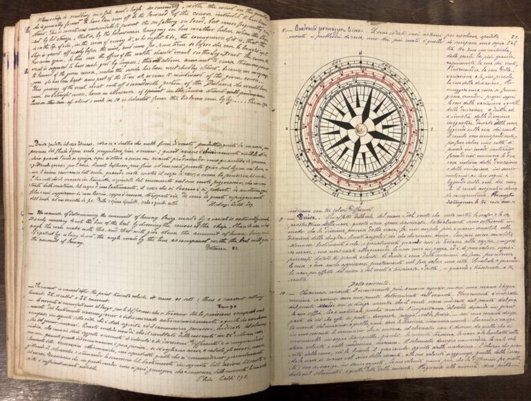 Nel manuale della nautica, in particolare, si trovano informazioni dettagliate su carte e strumenti nautici, nozioni tecniche come il calcolo dei coefficienti di deviazione a termini in lingue diverse (italiano, inglese, francese, spagnolo e tedesco) per indicare la tipologia dei porti e dei relativi fondali. In questo manuale, inoltre, il capitano disegna una splendida rosa dei venti roteante.
