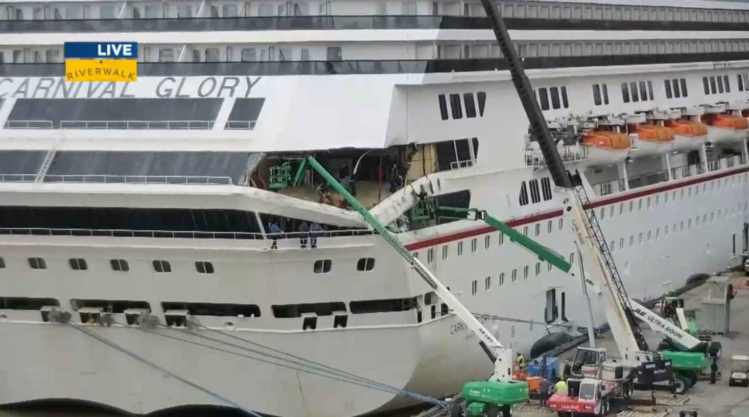 Al porto di New Orleans si è lavorato 24 ore su 24 per riparare lo squarcio in corrispondenza del ristorante di poppa della nave, sventrato dalla prua della Carnival Legend