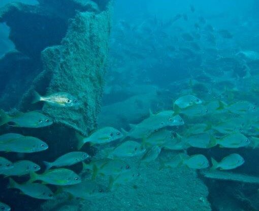 La navigazione procede con grandi difficoltà. La bufera non è ancora passata del tutto e si vede. Le onde sembrano giungere da ogni lato e stare sul gommone è come cavalcare un toro impazzito. Una volta giunti sul luogo del relitto è d’obbligo scendere direttamente: sarebbe impossibile ritrovarsi tutti in superficie. Una volta scesi sul fondo mi rendo conto che la visibilità non è quella di tante altre immersioni alle Canarie, a causa del periodo dell’anno, delle condizioni marine e di una specie di ciclone che ha colpito l’isola qualche mese prima, gettando in mare chissà quanti milioni di metri cubi di fango, che hanno ricoperto ogni cosa.