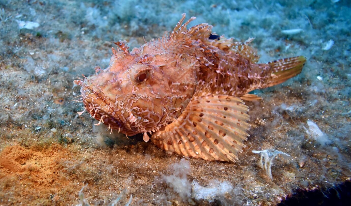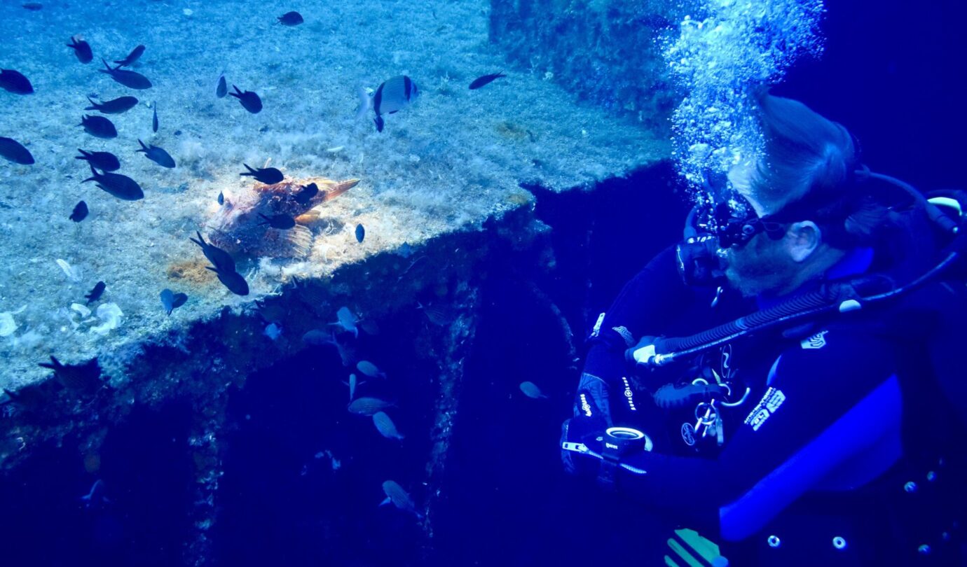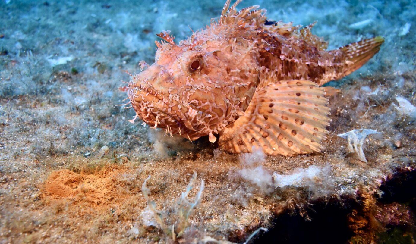 Poco prima di lasciarla per percorrere un tratto della costa, il bretone mi fa cenno di avvicinarmi per vedere qualcosa: è uno scorfano semplicemente magnifico, che non si allontana neppure per sfuggire alle mie grosse lampade. Che spettacolo. Se vi fosse venuta voglia di fare splendide immersioni nell’arcipelago maltese, non posso che ricordare e ringraziare gli amici dell’Orange Shark. Invece, se sono riuscito a farvi venire voglia di storie di mare, immersioni e navi affondate, vi rimando a Storie Sommerse e Relitti e Meraviglie, i miei libri pubblicati dalla casa editrice Il Frangente.
