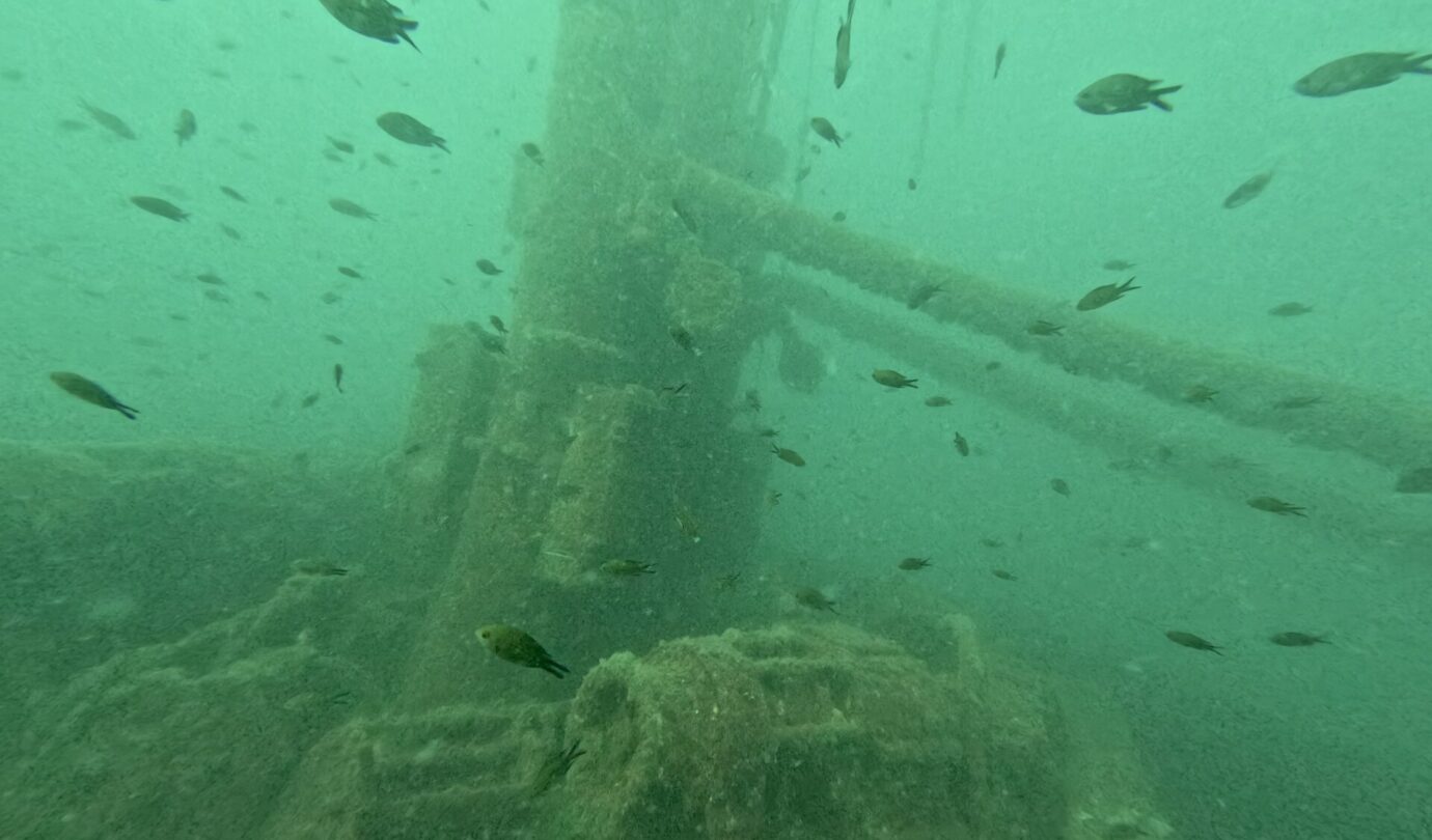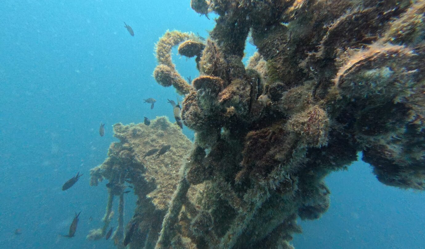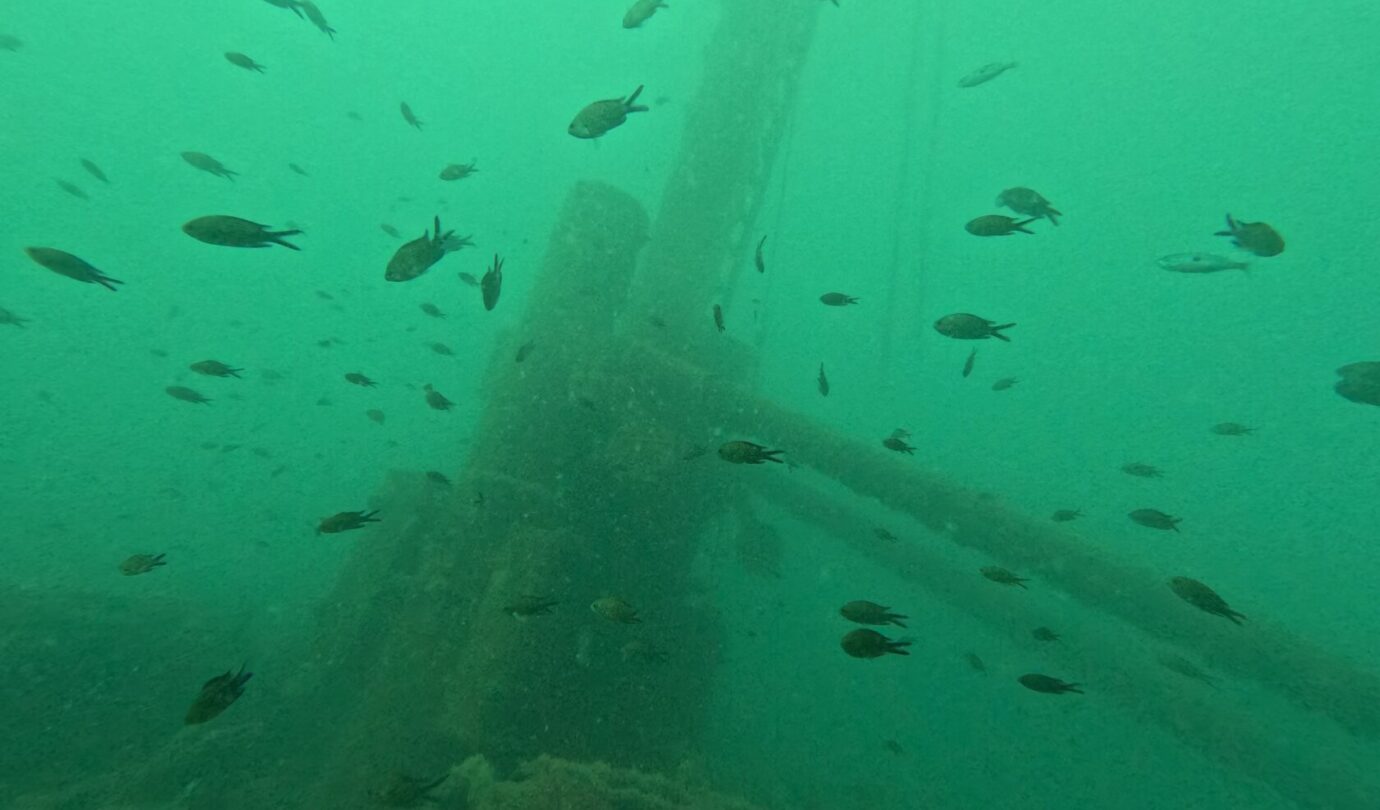Qui è strapieno di vita: le ostriche hanno completamente colonizzato la struttura e nuvole di pesci continuano a girarci intorno incuriositi dai due mostri vestiti di nero che emettono bolle. Vedere così tanta vita in queste acque è davvero uno spettacolo. La pesca indiscriminata ha fatto una strage qui intorno e le pareti sono di solito deserte ma, come sempre, anche questo relitto è diventato un’oasi di vita marina. Se vi piacciono le storie di mare, immersioni e navi affondate, vi rimando a Storie Sommerse e Relitti e Meraviglie, due libri usciti con la casa editrice Il Frangente. Non ve ne pentirete.