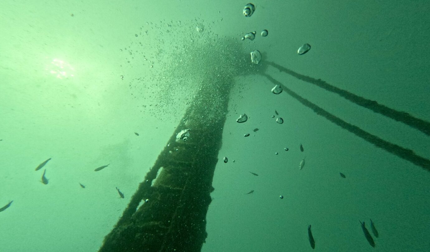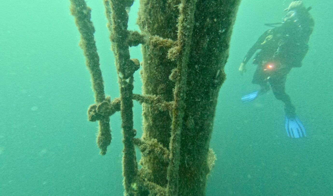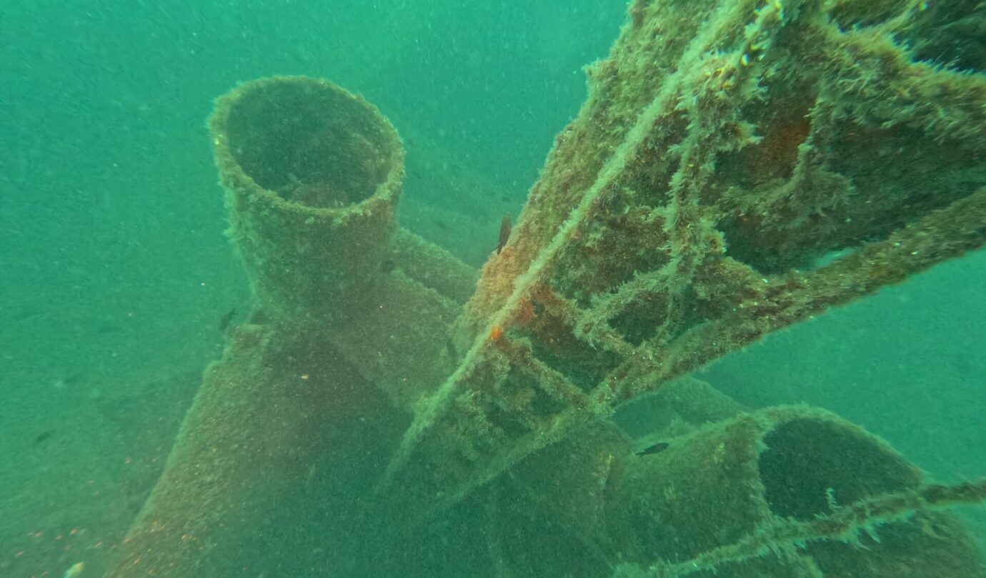 Qui è strapieno di vita: le ostriche hanno completamente colonizzato la struttura e nuvole di pesci continuano a girarci intorno incuriositi dai due mostri vestiti di nero che emettono bolle. Vedere così tanta vita in queste acque è davvero uno spettacolo. La pesca indiscriminata ha fatto una strage qui intorno e le pareti sono di solito deserte ma, come sempre, anche questo relitto è diventato un’oasi di vita marina. Se vi piacciono le storie di mare, immersioni e navi affondate, vi rimando a Storie Sommerse e Relitti e Meraviglie, due libri usciti con la casa editrice Il Frangente. Non ve ne pentirete.