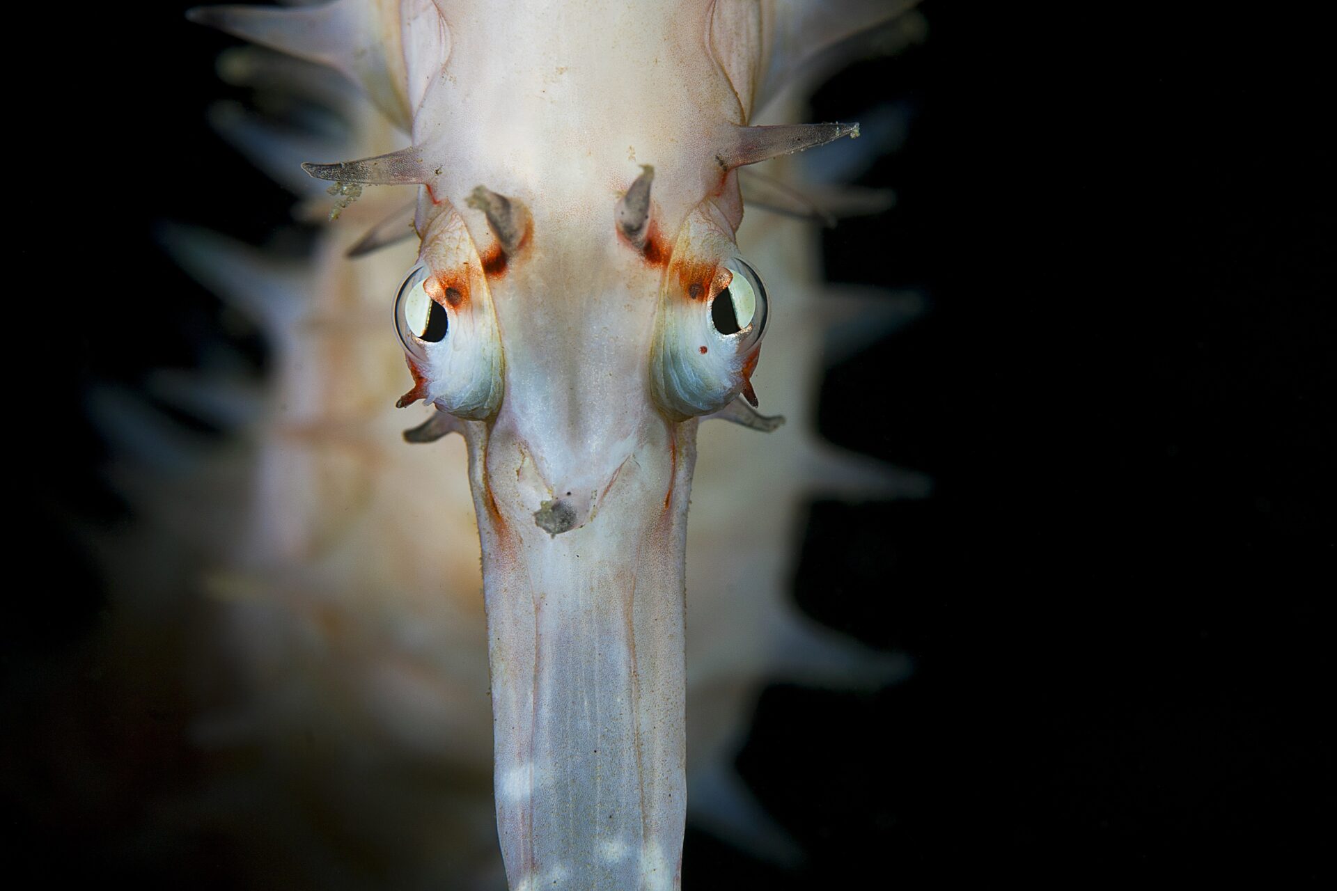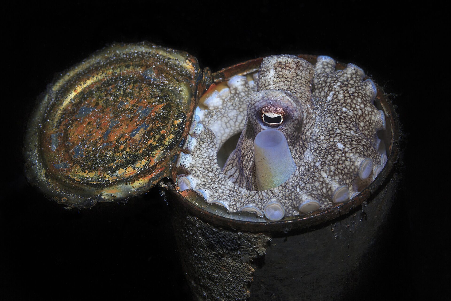 Sono molto legato a questo scatto, fatto qualche anno fa durante un’immersione notturna ad Anilao, nelle Filippine. Questo polpo del cocco (Amphioctopus marginatus), così chiamato perché spesso utilizza i gusci delle noci di cocco o delle conchiglie per proteggersi, stava passeggiando durante la notte su un fondale sabbioso portandosi appresso questa vecchia lattina. Appena mi sono avvicinato, illuminandolo con la mia Focus Light, il polpo si è fermato, ha posato la lattina e ci si è messo dentro come per ripararsi. Dopo un paio di scatti di prova, ho deciso di montare uno snoot sul mio flash e di illuminare il soggetto isolandolo dallo sfondo sabbioso, così da enfatizzare al massimo questa particolare situazione, che deve farci riflettere sullo stato dei nostri mari e su come stiamo facendo ancora poco per limitare l’inquinamento.