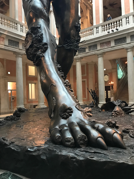 “I tesori del relitto dell’Incredibile” è, per l’appunto, una incredibile invenzione dell’artista inglese Damien Hirst che si è inventato tutto quanto, dalla nave affondata al suo ritrovamento, realizzando, col solo limite della sua fantasia, i “tesori” esposti, le fotografie, le interviste e anche il documentario subacqueo del recupero della nave.