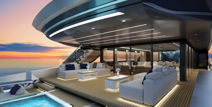 Sia il main deck che l’upper deck sono infatti vetrati e apribili su tre lati, in modo da garantire un’autentica contatto con l’esterno in ogni stagione, mentre l’area a poppa si sviluppa su tre livelli degradanti verso l’acqua e culmina in una scenografica piscina infinity. Il garage laterale per il tender preserva il layout pulito e aperto del ponte di poppa, esaltando sia gli spazi sia l’armonia delle linee. All’interno lo yacht offre invece ambienti completamente su misura, progettati e realizzati per riflettere la visione e lo stile di vita del cliente.