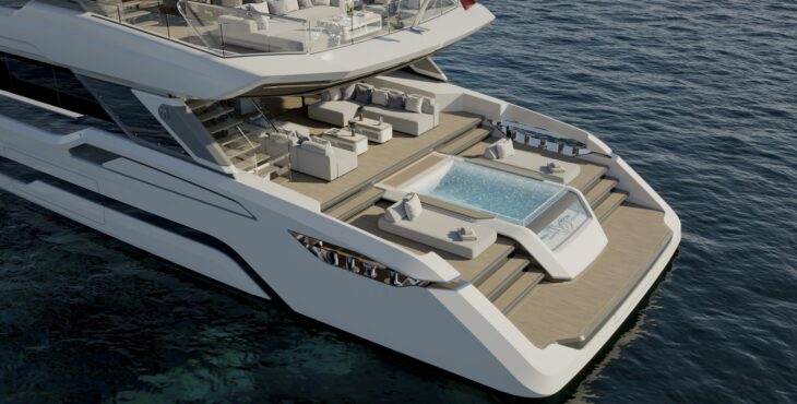 Numerosi i tratti distintivi che ne hanno decretato il successo, come l’armonioso senso di apertura e continuità tra interni ed esterni, grazie alle porte del salone del main deck completamente a scomparsa e alle ampie finestrature a tutta altezza che regalano una vista avvolgente a 270 gradi, un main deck e un upper deck interamente vetrati apribili su tre lati e la scenografica zona di poppa articolata su tre livelli digradanti verso l’acqua, dove trova posto un’elegante infinity pool affacciata sul mare. A questi elementi si aggiungono poi un garage laterale per il tender che libera completamente il ponte di poppa da ingombri tecnici e un interior design creato su misura secondo lo stile e le esigenze dell’armatore.