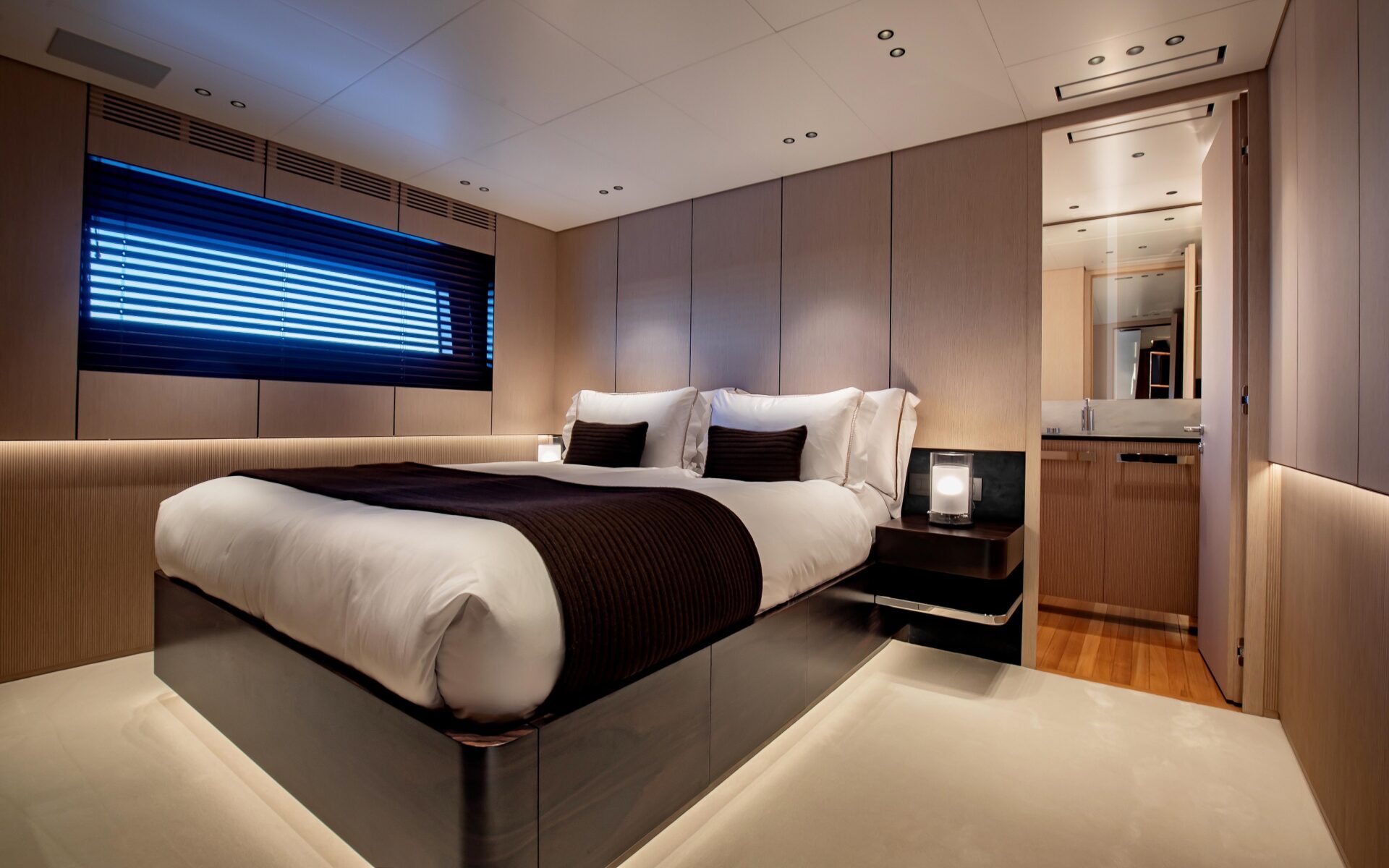 Nel passaggio tra il main salon e la zona armatoriale si trova poi l’ambiente che rappresenta al meglio la passione dell’armatore verso il design, ovvero lo studio adiacente alla cabina, dove è appunto esposta una scultura commissionata dal proprietario a un artista hawaiano, a testimonianza del suo profondo legame con quel Paese. La scultura è posizionata su un mobile a sbalzo, appositamente realizzato per arricchire questo spazio con un tocco di unicità e raffinatezza.