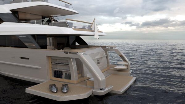 Il nuovo modello ripensa anche la zona di poppa ampliandone spazi e comfort rispetto ai modelli precedenti della linea SD. Una volta all’ancora, questa zona si trasforma in una spiaggetta di ben 19 metri quadri calpestabili grazie ai portelloni laterali apribili per tuffarsi e godere del sole au bord de l’eau.