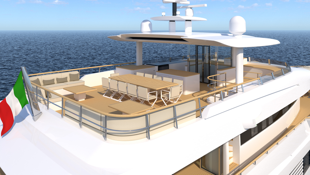 “Fin dal principio – racconta Tommaso Spadolini – le richieste dell’armatore sono state molto chiare. Innanzitutto avere grandi spazi, con il minor numero possibile di dislivelli, che fossero coperti e protetti dal vento, così da poter vivere lo yacht non solo d’estate ma anche nella mezza stagione. Poi la presenza di un ascensore che collegasse tutti i ponti. Infine, un flying bridge che non fosse un classico flying bridge“.