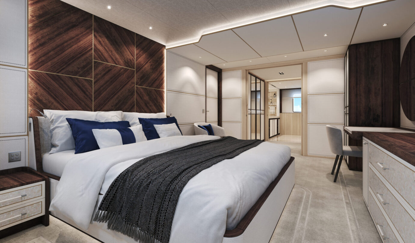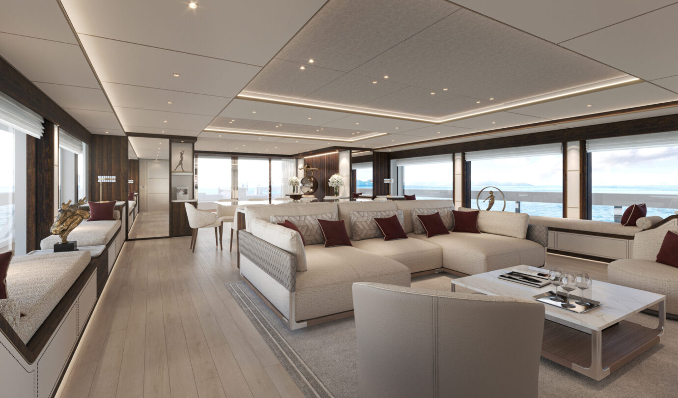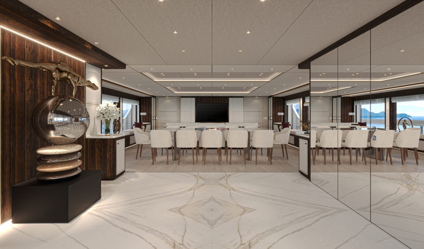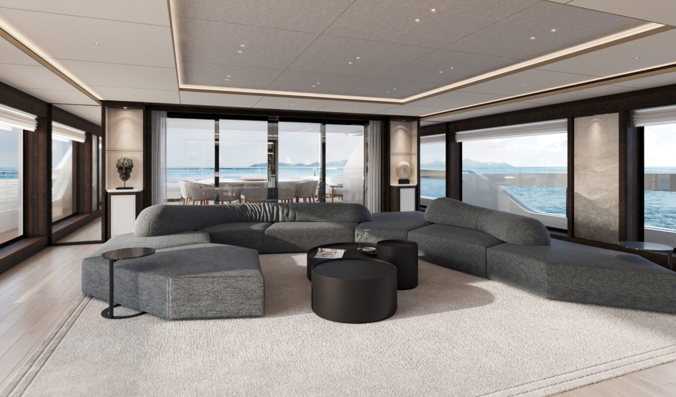 Gli interni, curati dal Sanlorenzo Style Department, propongono una palette calda e materica che combina legni scuri, marmo Calacatta Borghini, madreperla e dettagli color champagne. Ogni elemento è realizzato secondo la filosofia made-to-measure, trasformando lo yacht in un ambiente sartoriale dal carattere unico.