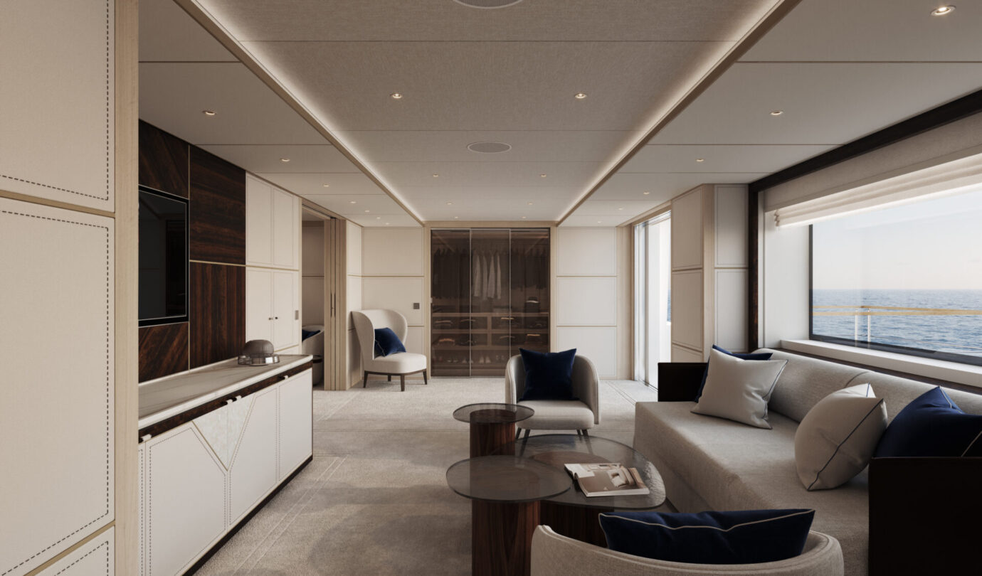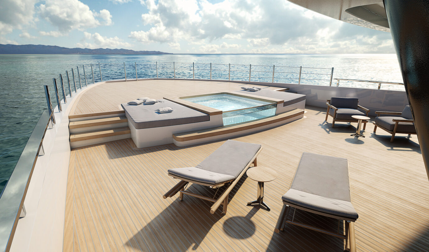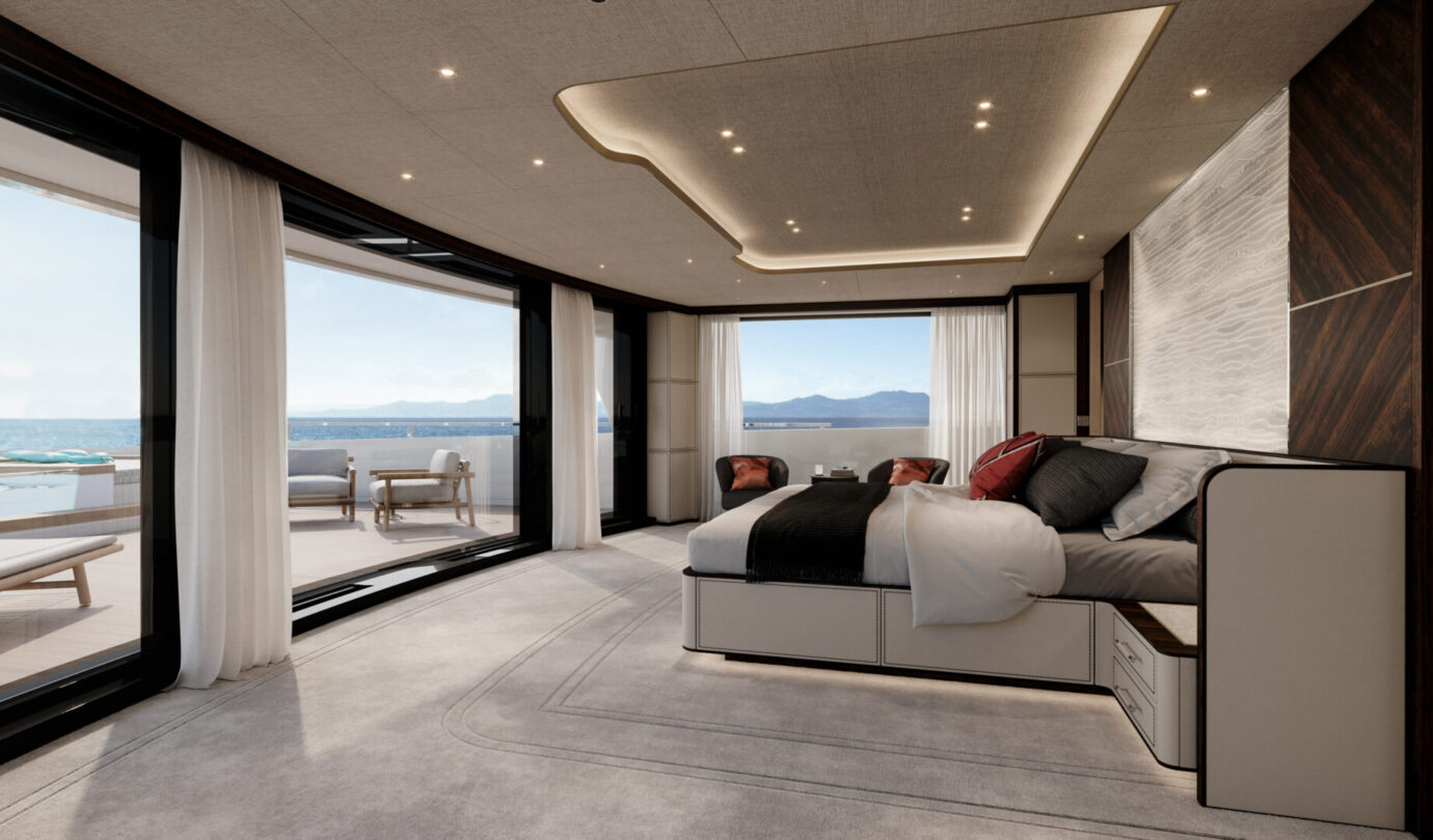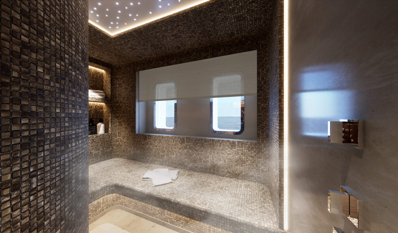 Le cabine VIP full-beam godono di luce naturale grazie a grandi superfici vetrate, mentre la Supreme VIP sul main deck offre un livello di privacy e comfort tipico delle suite armatoriali. Il salone principale si apre su una piscina a sfioro, creando un continuum visivo tra interni ed esterni, mentre il ponte armatoriale è concepito come una residenza privata sospesa sull’acqua, completa di spa e vetrate panoramiche.