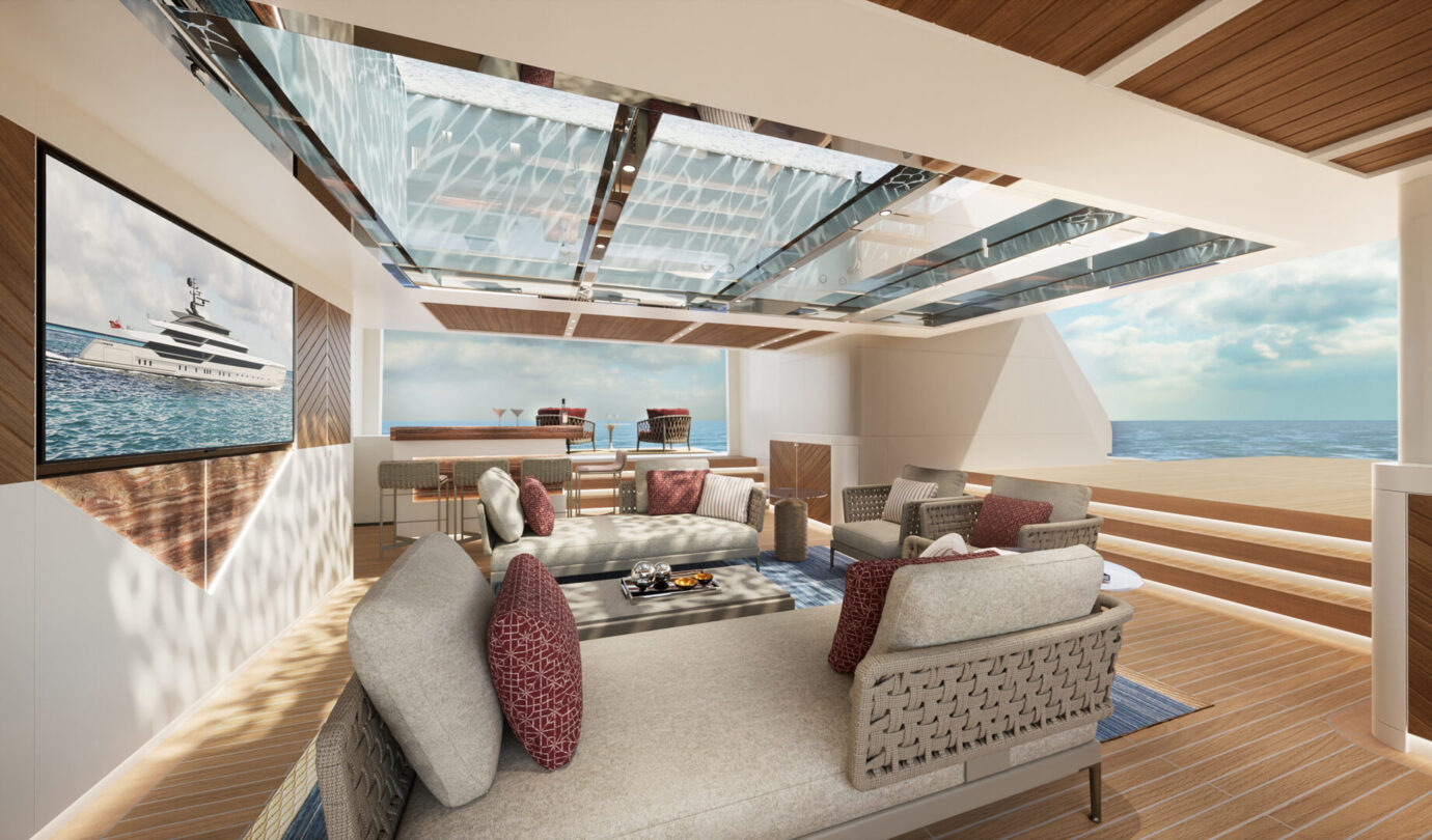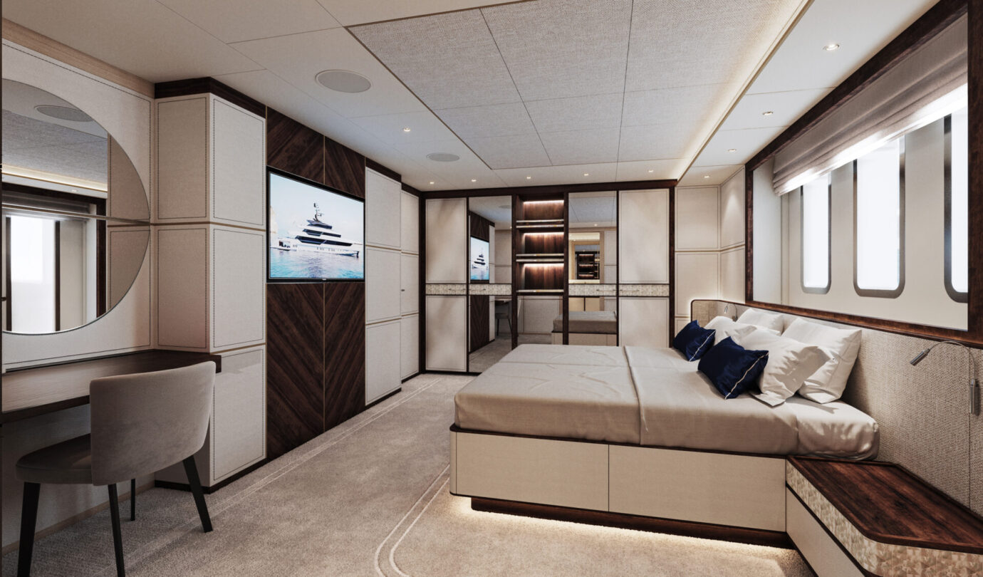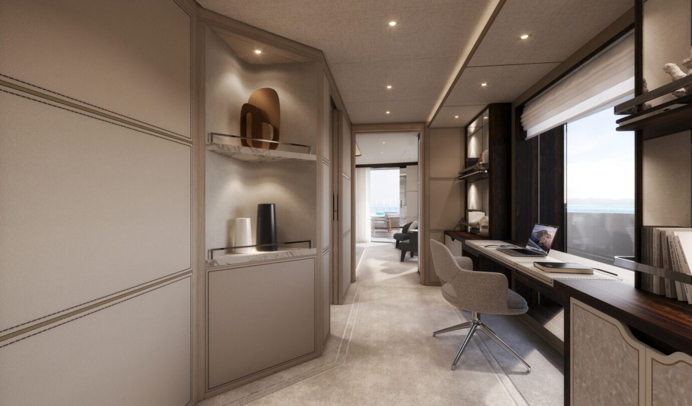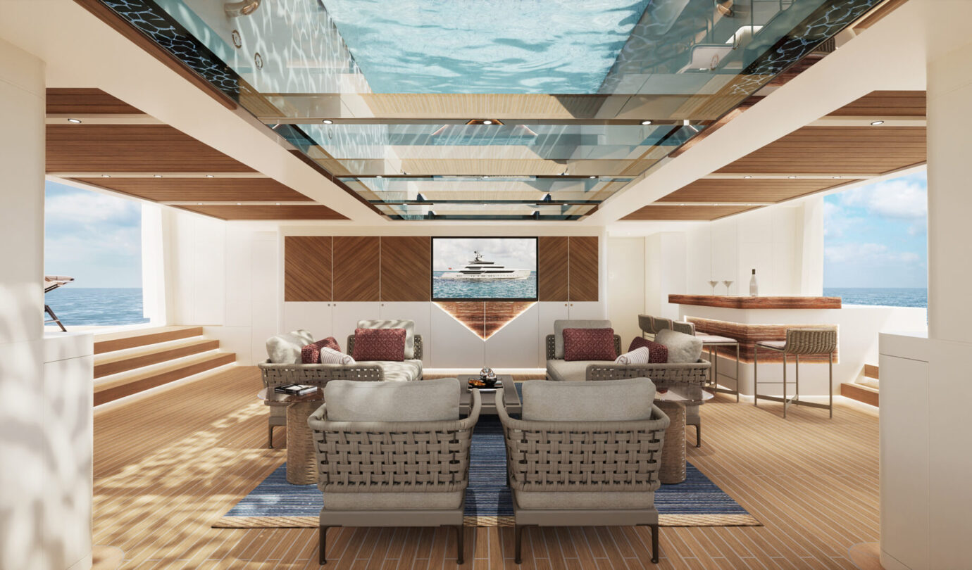 Le cabine VIP full-beam godono di luce naturale grazie a grandi superfici vetrate, mentre la Supreme VIP sul main deck offre un livello di privacy e comfort tipico delle suite armatoriali. Il salone principale si apre su una piscina a sfioro, creando un continuum visivo tra interni ed esterni, mentre il ponte armatoriale è concepito come una residenza privata sospesa sull’acqua, completa di spa e vetrate panoramiche.