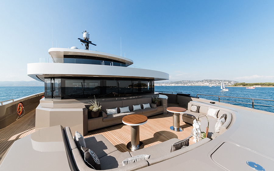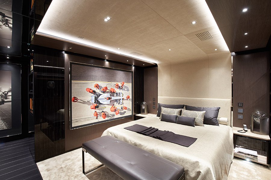 All’interno del proprio appartamento, l’armatore può godere di uno studio privato e di una camera da letto con letto centrale, vetrate a tutta altezza che assicurano una vista a 180°, un lucernario vetrato e un accesso diretto verso due aree relax esterne (una con coffee table e poltroncine, l’altra con un grande prendisole e una Jacuzzi). Sul ponte armatoriale, totalmente privato e con accesso diretto all’helideck touch and go di poppa (con certificazione fino a 4,5 tonnellate), sono disponibili anche un bar, un salone, un angolo esterno per la colazione e un bagno di servizio con doccia. Il ponte poppiero è invece caratterizzato da una piscina trasversale di 6 metri, divani e schermo TV popup recessato nella sovrastruttura per trasformare tutta la zona in un vero e proprio cinema all’aperto.