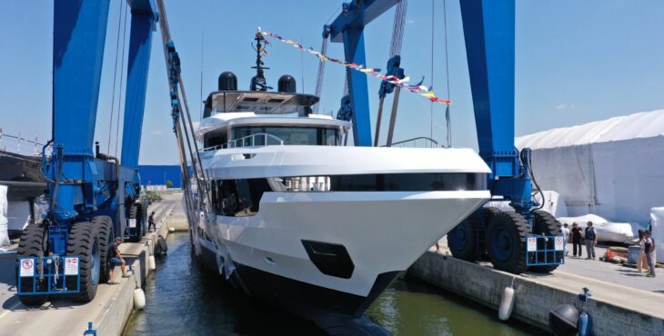 A Pisa è stata varata la sesta unità del Mangusta Oceano 44, il tri-deck dislocante che rappresenta una delle massime espressioni del design Mangusta sulle lunghe percorrenze. Frutto della collaborazione tra l’Ufficio Engineering di Overmarine Group, il designer Alberto Mancini per le linee esterne e P.L.A.N.A. Design per l’architettura navale, questa imbarcazione di 44 metri presenta interni e layout sviluppati su misura dal design team del cantiere in sinergia con l’armatore. La connessione tra interni ed esterni è poi curata in ogni dettaglio, evidenziata dal design fluido e dall’utilizzo di superfici vetrate a tutta altezza.