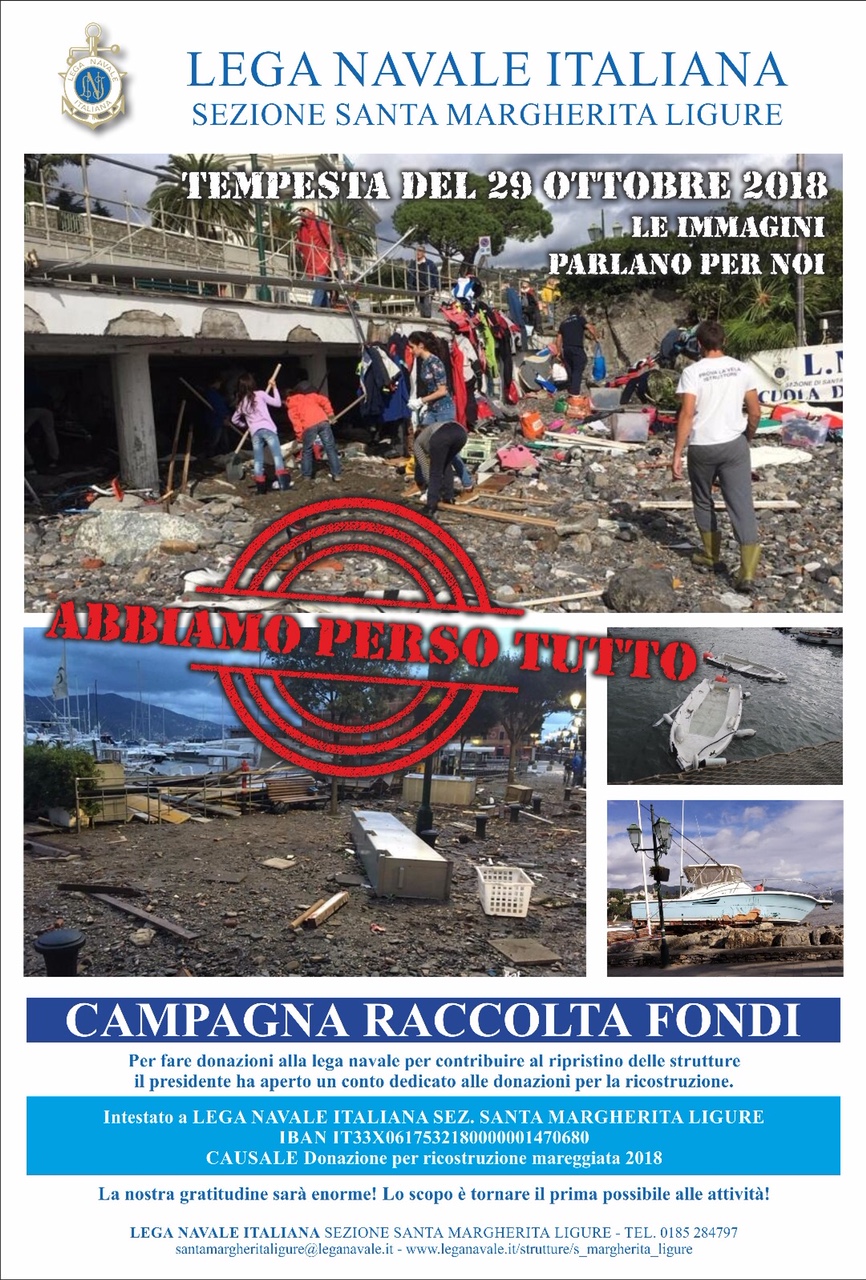 La Lega Navale di Santa Margherita Ligure ha lanciato una campagna di raccolta fondi per riprendersi il prima possibile della mareggiata che l’ha distrutta portandole via tutto ma non la forza di proseguire